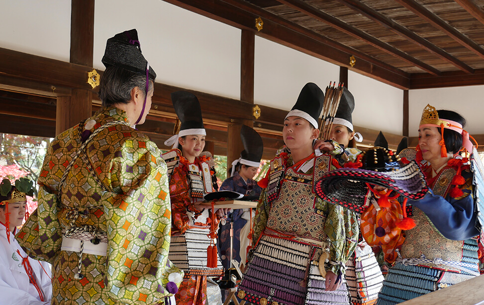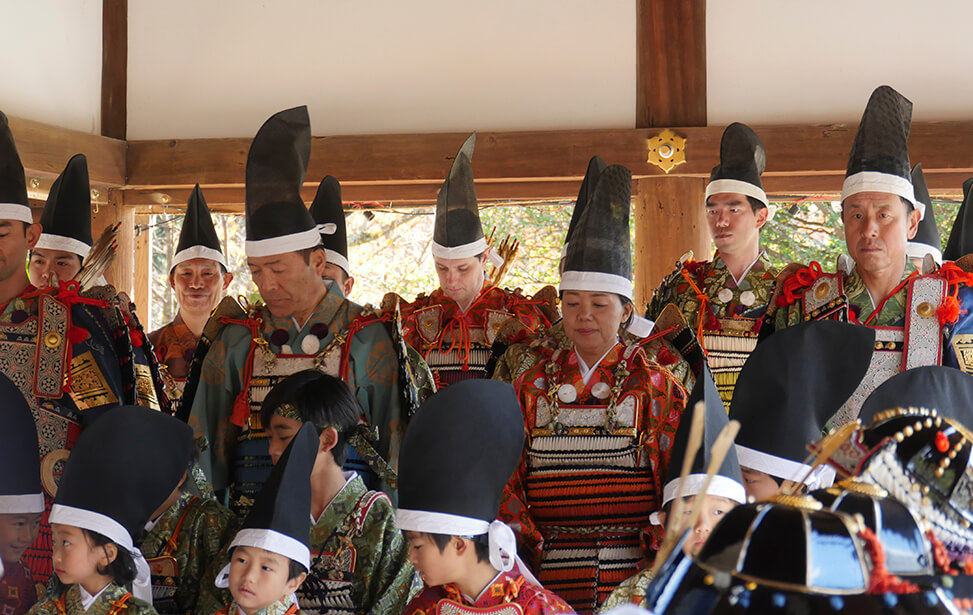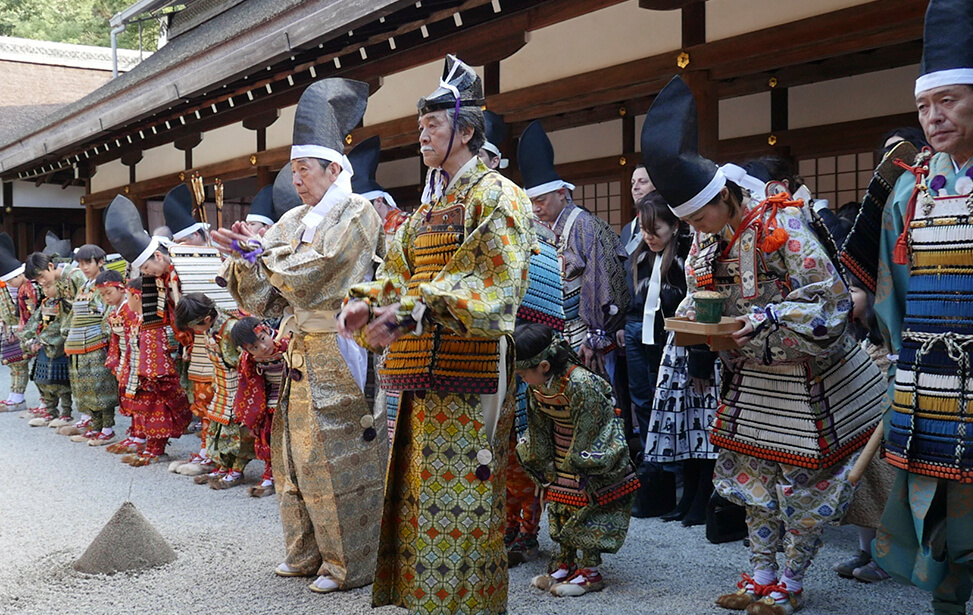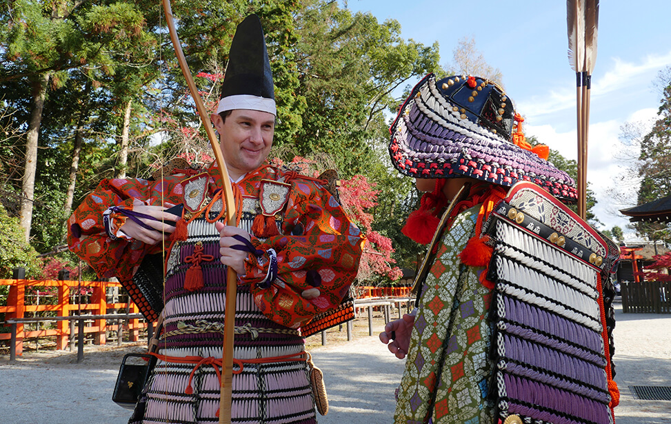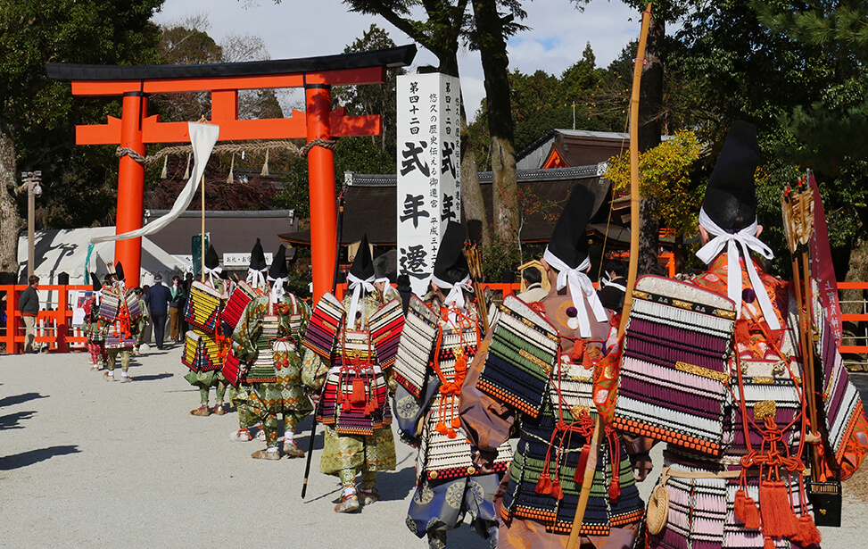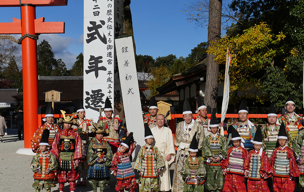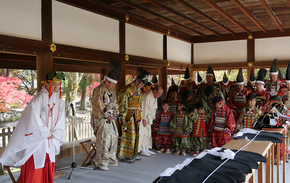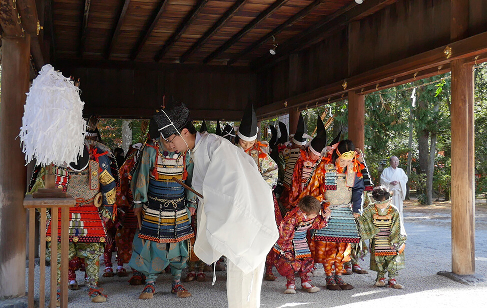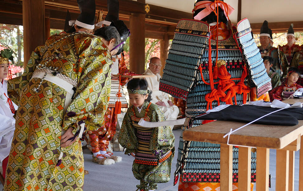 京都の世界文化遺産である上賀茂神社では大鎧の着初式が毎年11月23日に行われています。